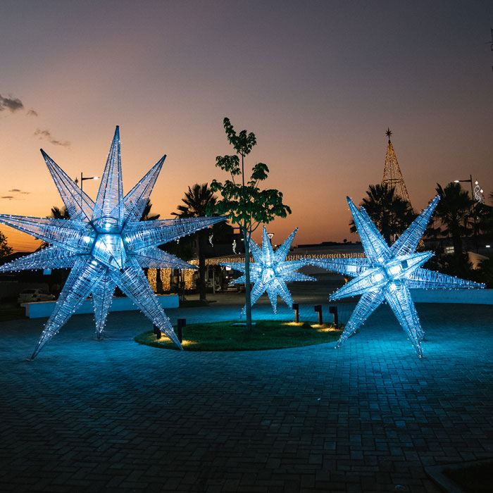 Nenhum projeto estaria completo sem a iluminação. Ela é escolhida com cuidado, valorizando cada detalhe da escultura e criando atmosferas que despertam emoção e encantamento. A luz é o fio condutor que transforma estruturas em experiências visuais, capazes de marcar a memória de quem passa.