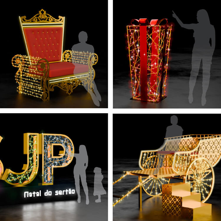 Cada projeto nasce de um mergulho profundo na cultura e na identidade do lugar. Buscamos símbolos, memórias e referências que traduzam o espírito daquela comunidade. Essa pesquisa se mistura ao universo natalino, criando esculturas e ambientes que são, ao mesmo tempo, familiares e surpreendentes.